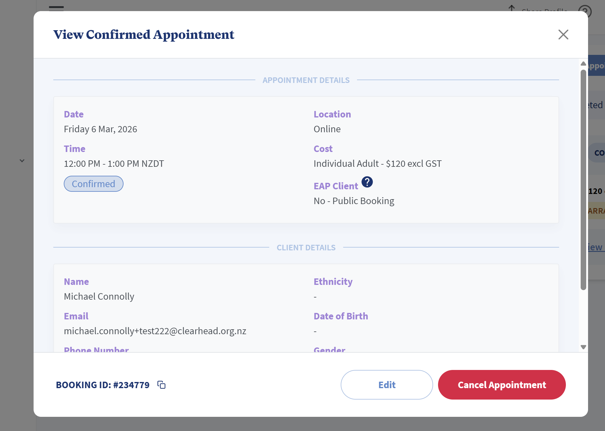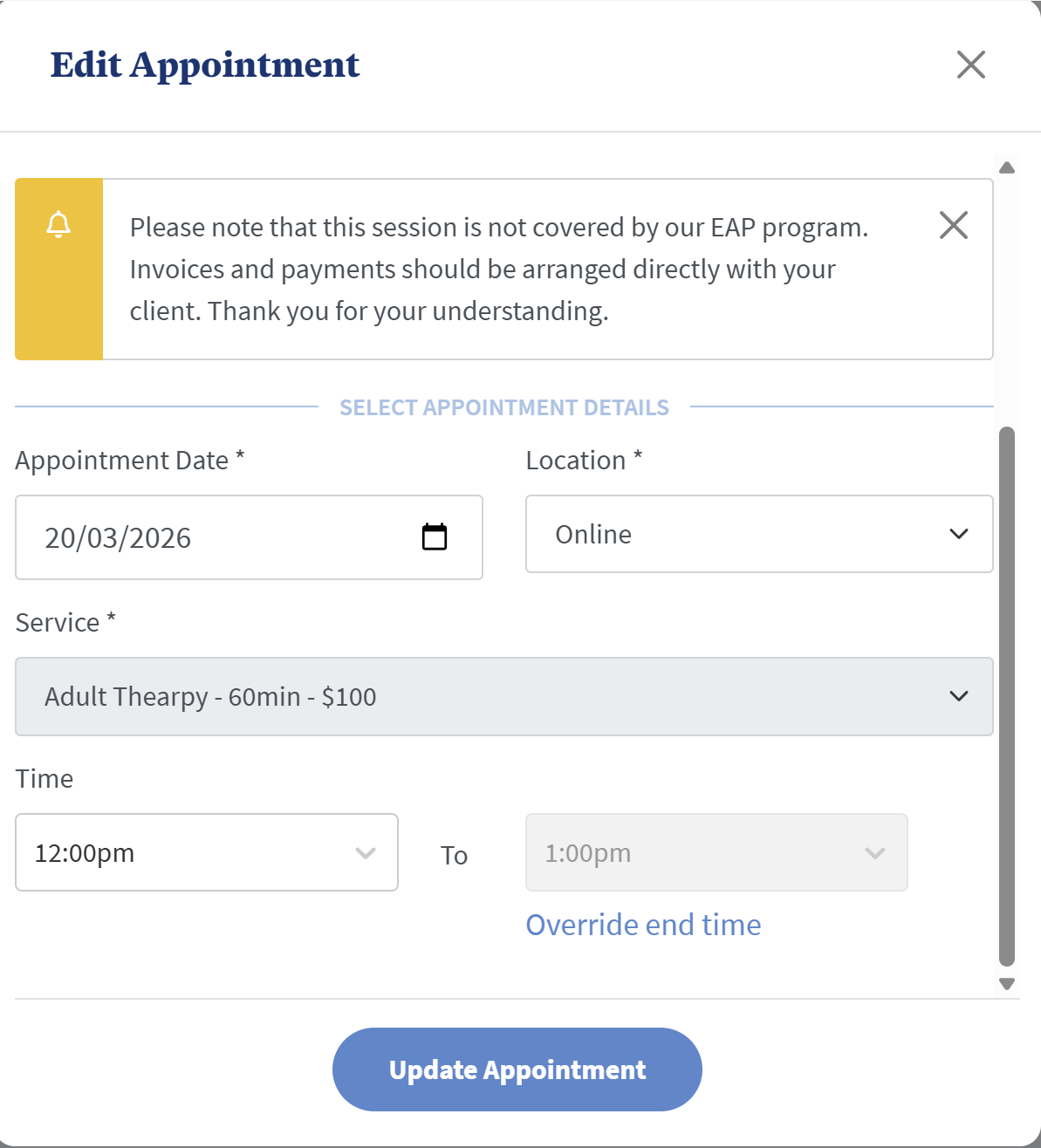 - Select Update Appointment. This will automatically update your provider portal and email changes to the client.
