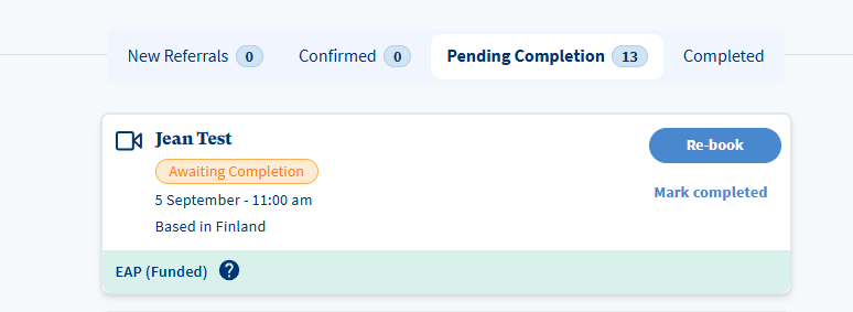 Step 2: Click on the Pending Completion tab, here you will find all appointments that have finished and are needing action from you.