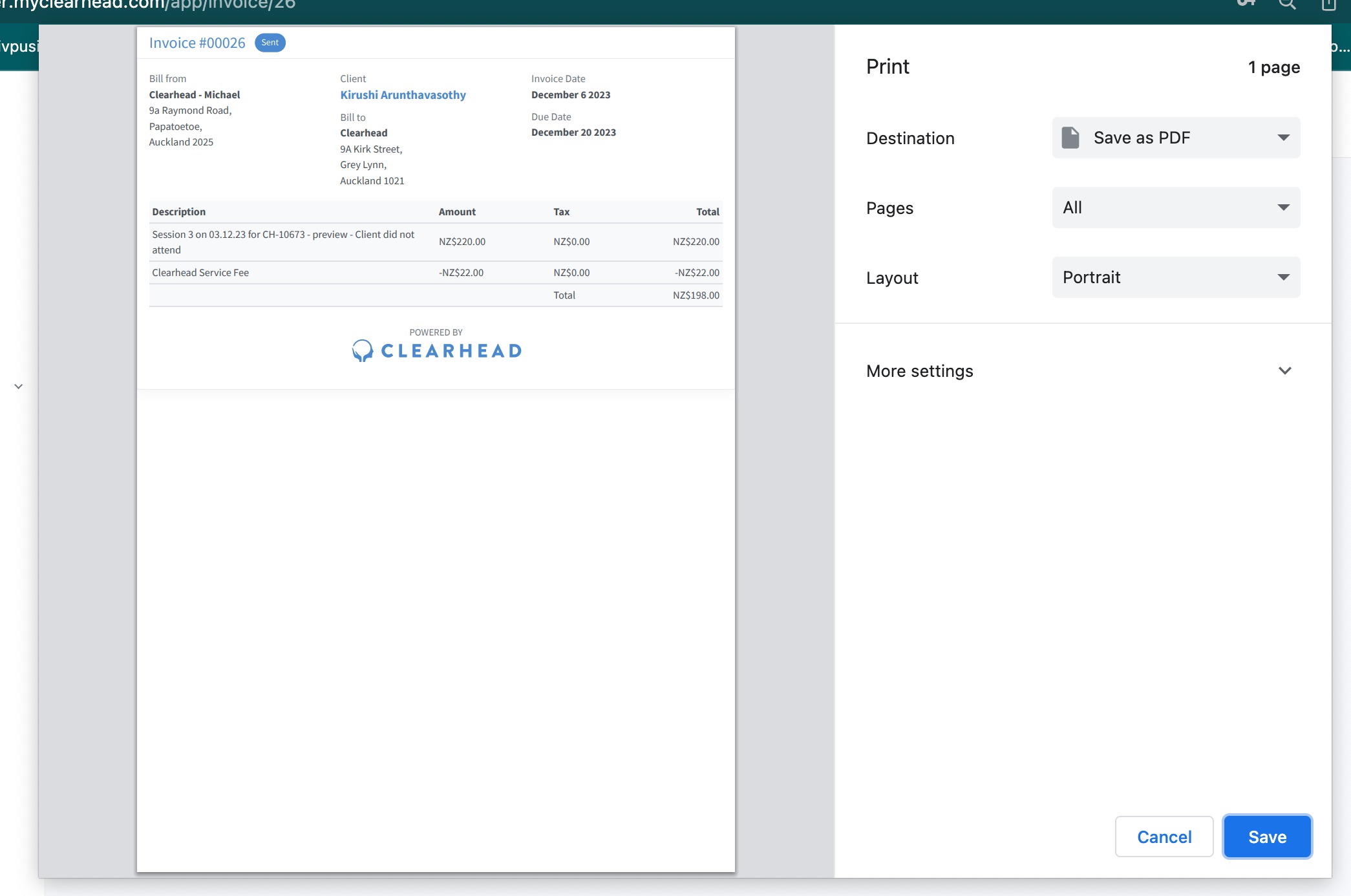 Step 6: Once it’s sent you can 'Print' (download) the invoice as a PDF and keep it for your invoicing / filing system.