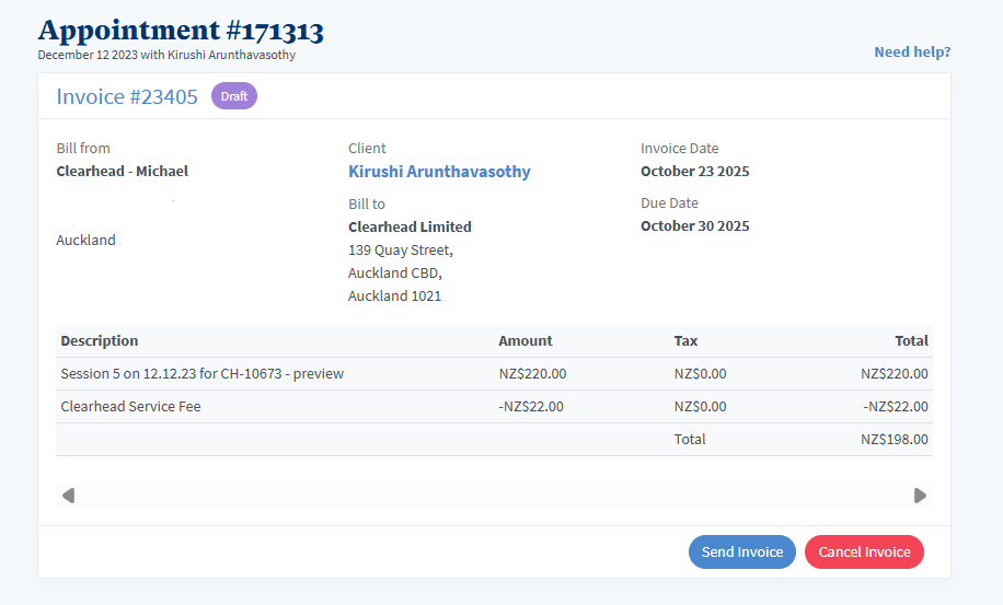 Step 5: You’ll then be taken to the Invoices screen, your generated invoice is in a draft state so that you can confirm the details of the appointment highlighted.
